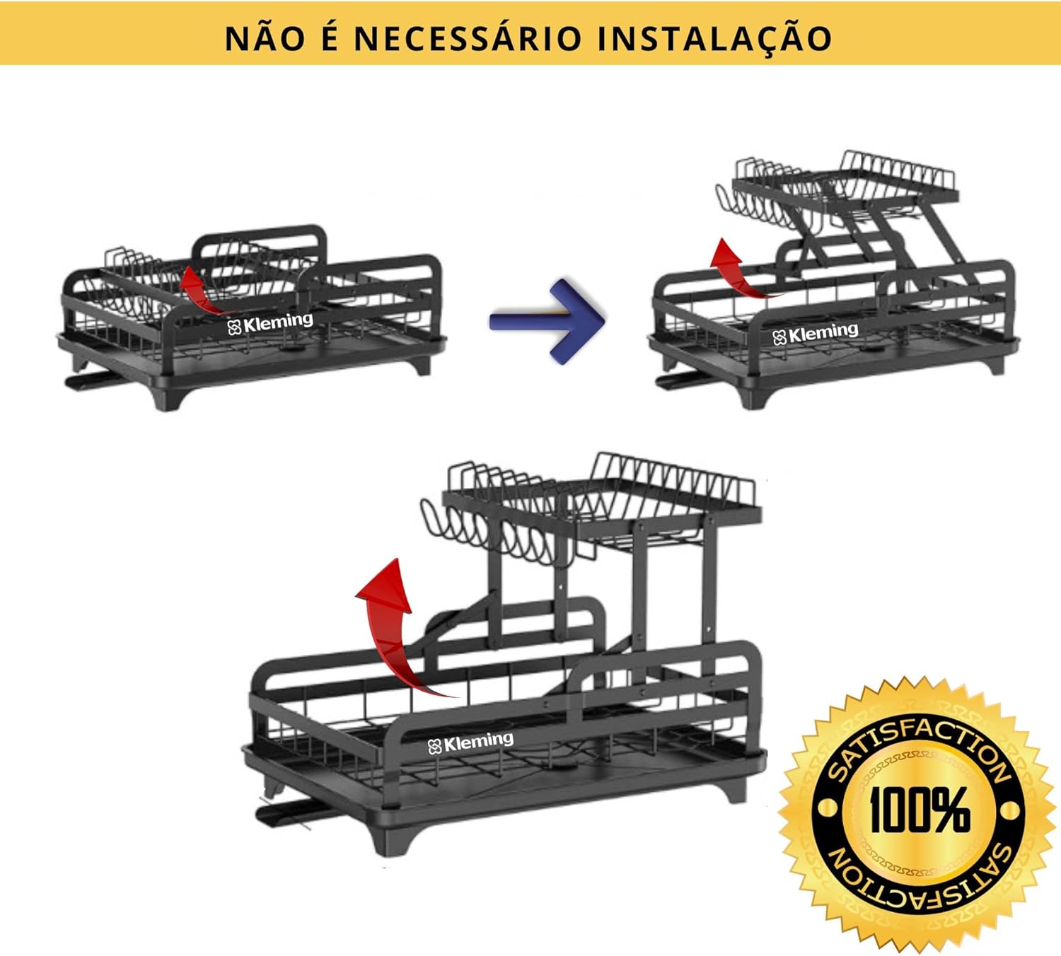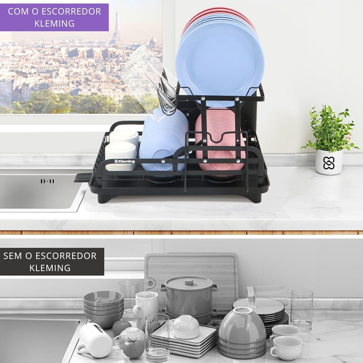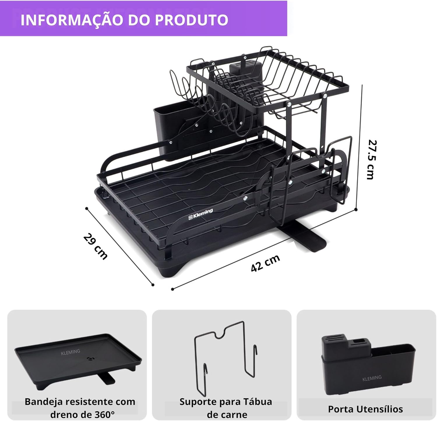 Escorredor de Louças de Aço Carbono Inoxidável, Resistente à Ferrugem, Escorredor de Pratos Multifuncional para Bancada de Cozinha com Bandeja Drenagem automática, Antiderrapante, Preto.