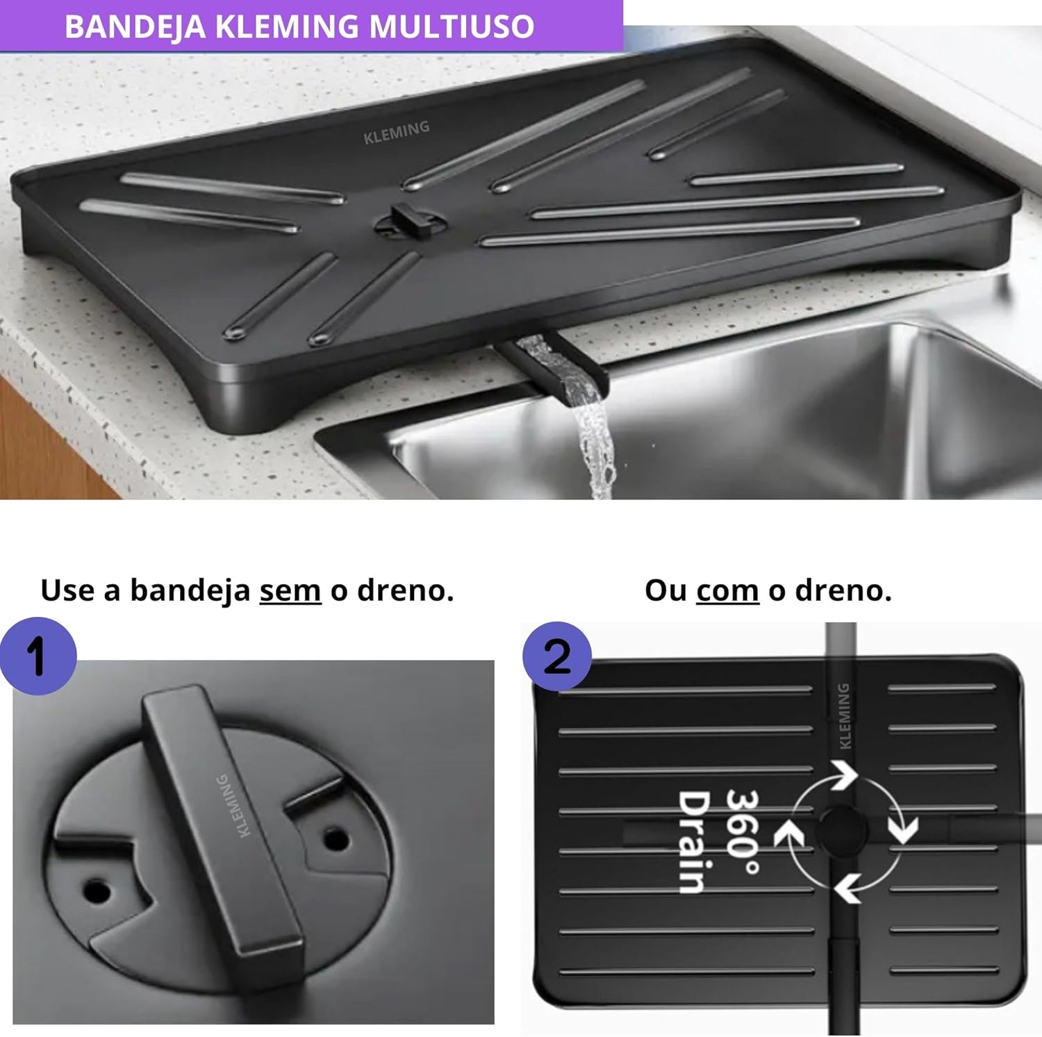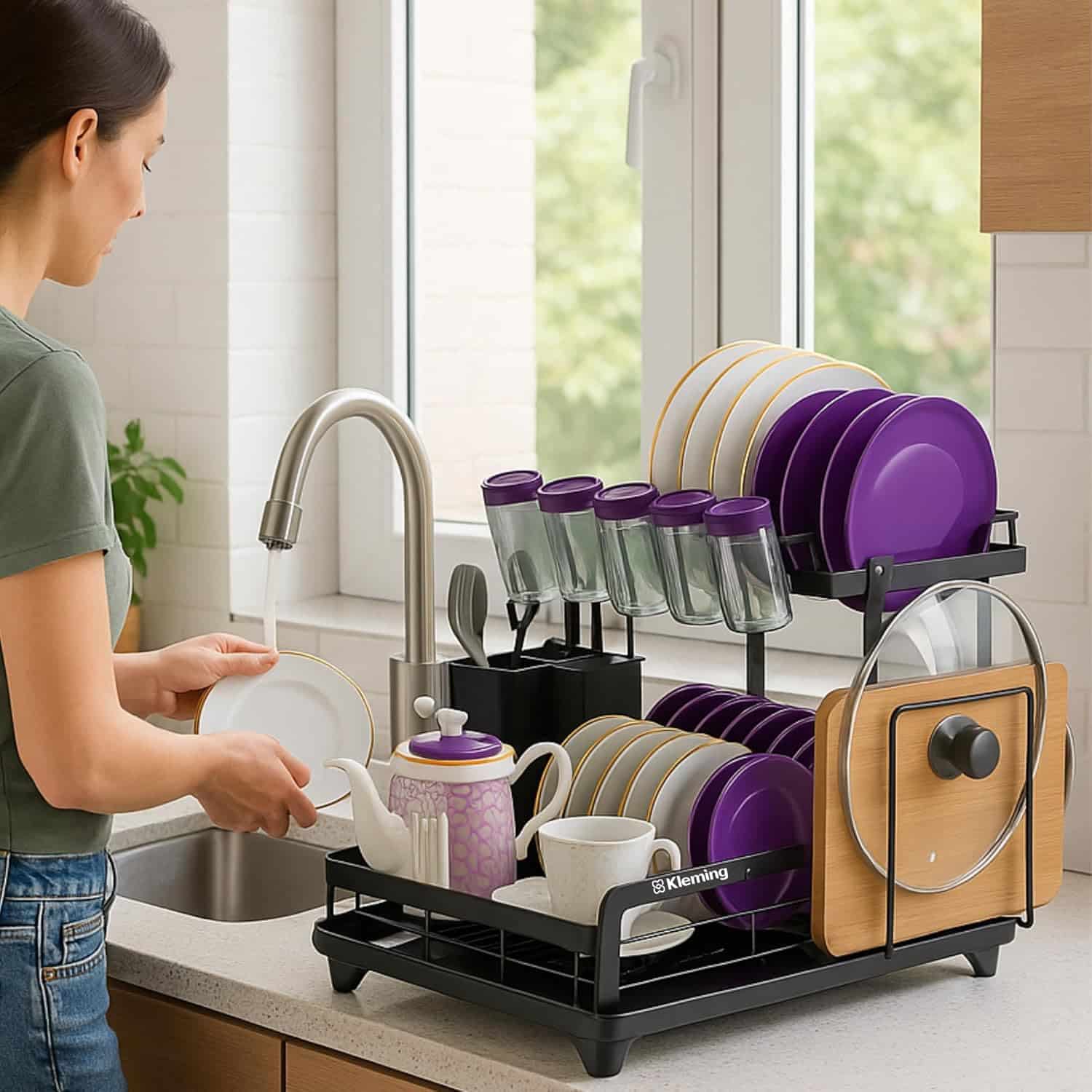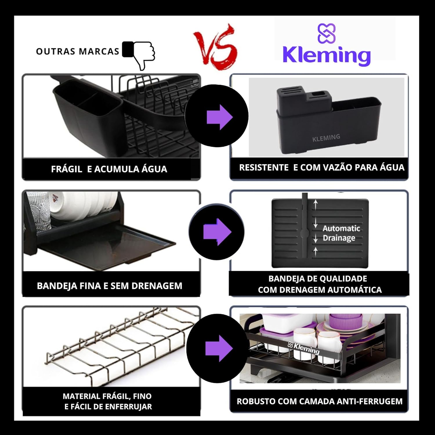 Escorredor de Louças de Aço Carbono Inoxidável, Resistente à Ferrugem, Escorredor de Pratos Multifuncional para Bancada de Cozinha com Bandeja Drenagem automática, Antiderrapante, Preto.