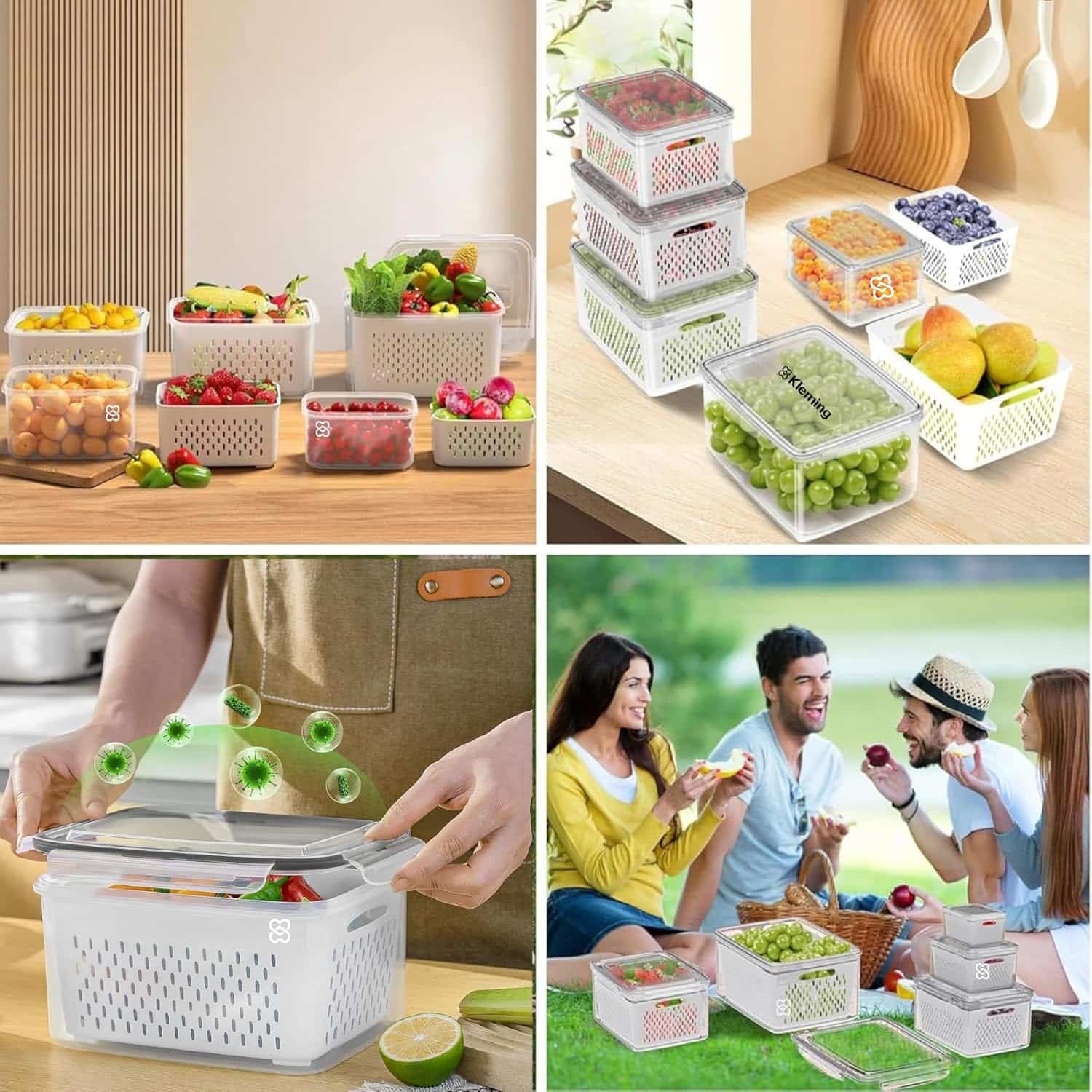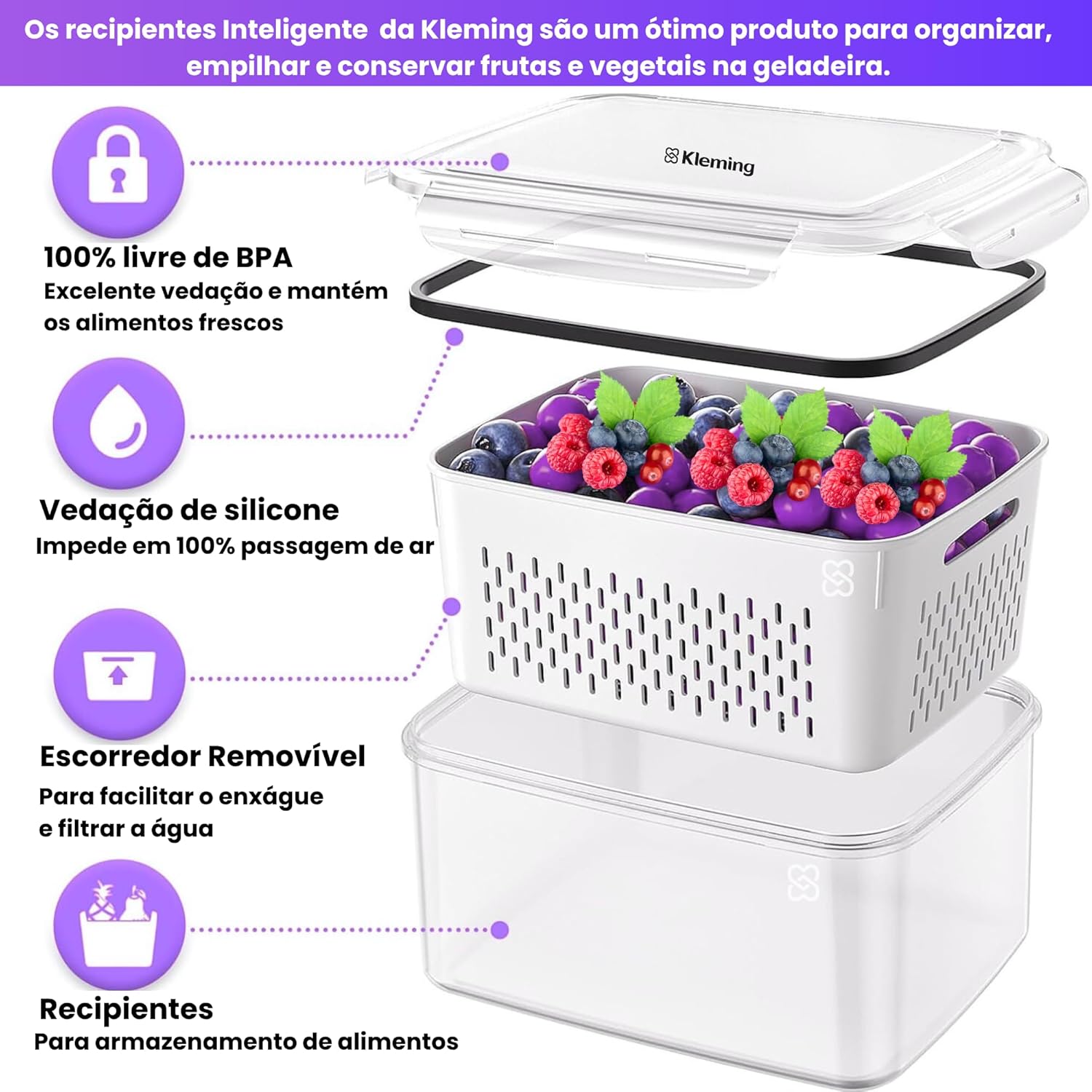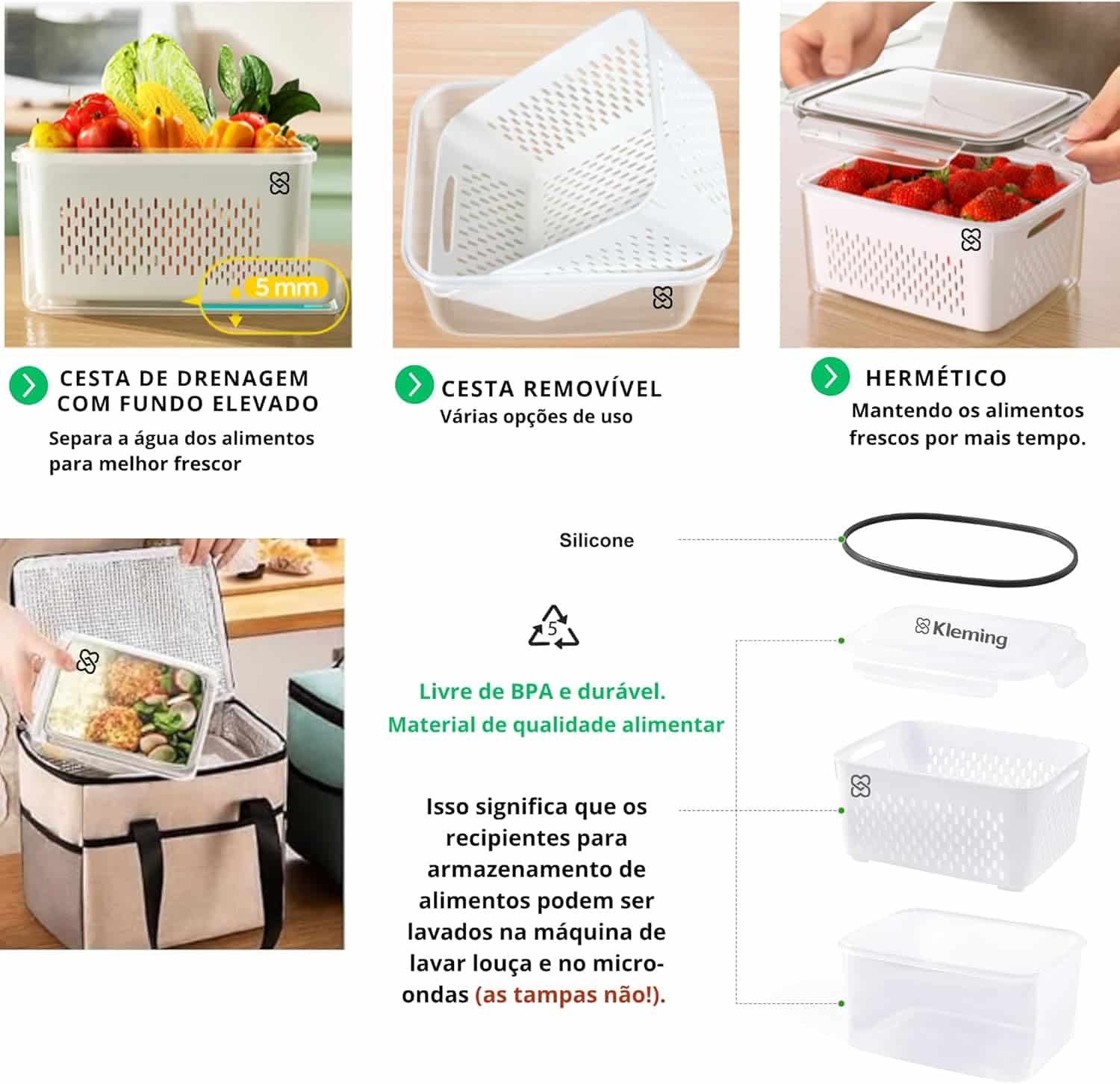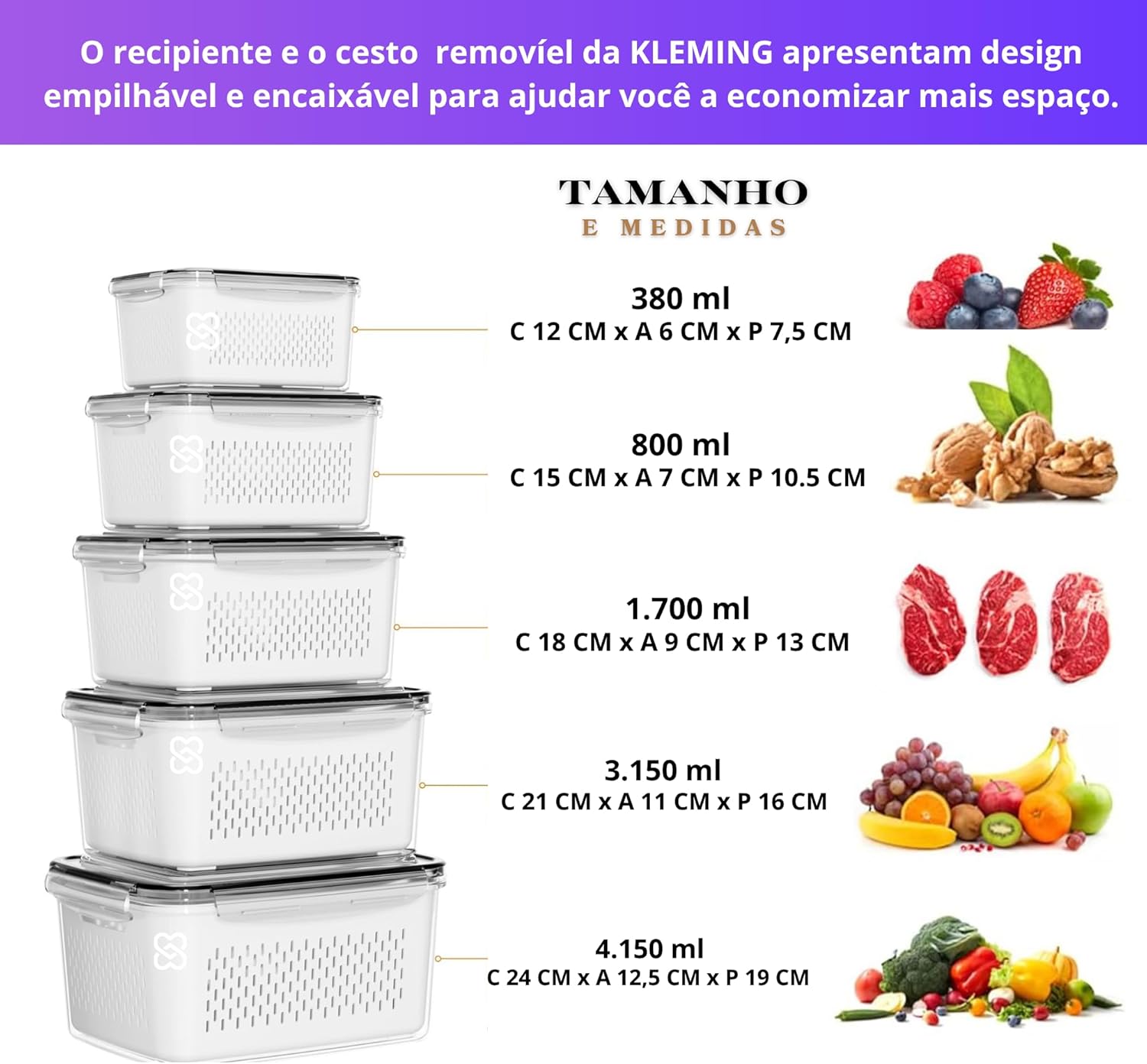 Kit 5 Organizadores de Geladeira, Hermético,com Escorredor,Cesto Removível, à prova de vazamento, OU Organizador Clear Fresh, Organizador de Geladeira,Armário,Cesto Organizador